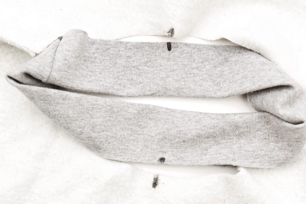 First, fold the ribbing. You can carefully press the fold with an iron on low heat to make the fold crisp. Then, mark notches that correspond to mid-back, shoulder seams, and mid-front using the suggestions above. Either clip the fabric or use a pen for the notches.