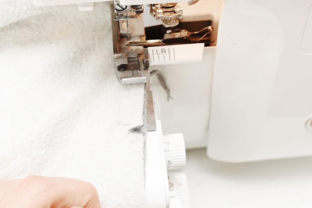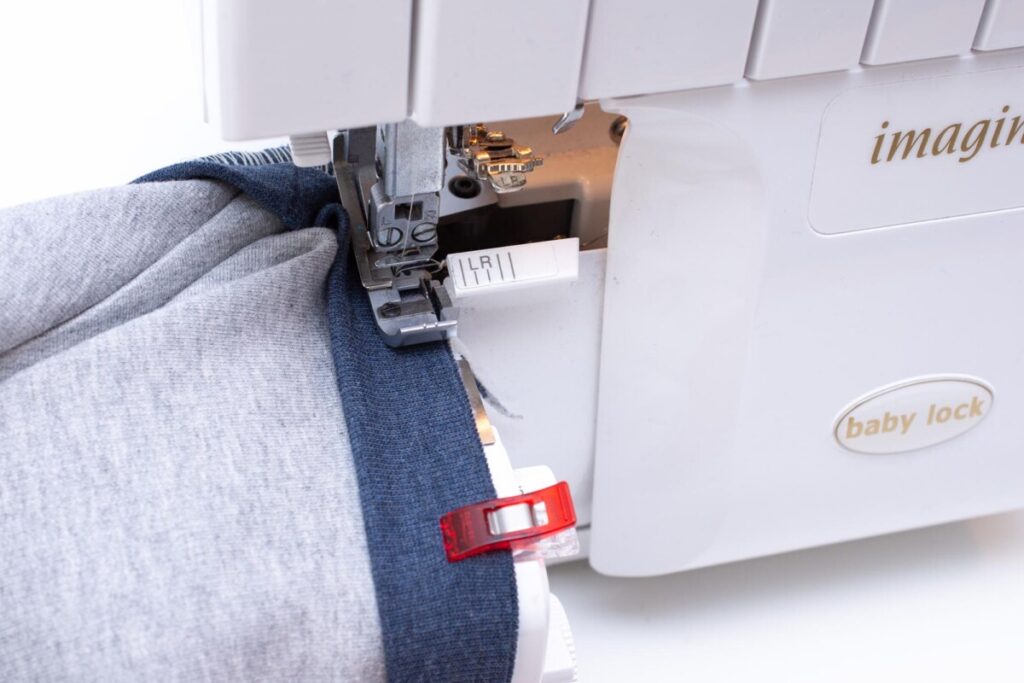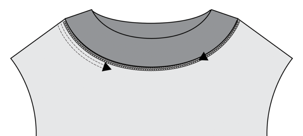 Use either a serger or a sewing machine stretch seam to attach the ribbing. Stretch the neckband while sewing, making sure the notches align. Don’t stretch the neckline, just the neckband.