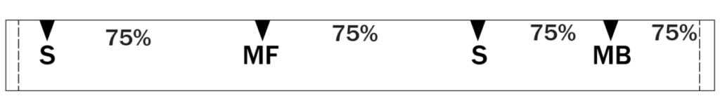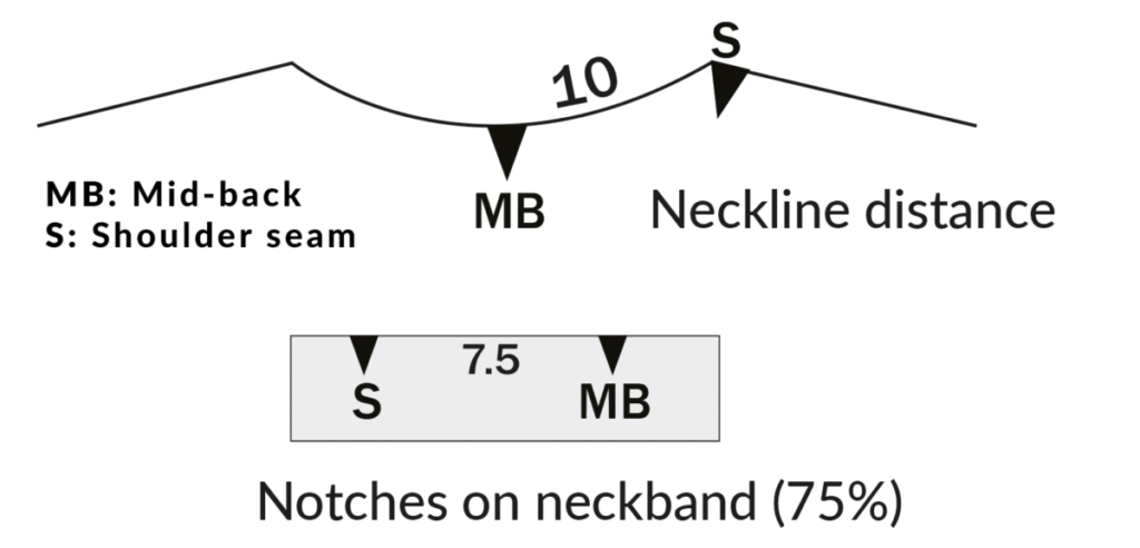 This means that the corresponding distance on the neckband should be 7.5 cm if we are using a neckband that is 75% of the neckline circumference.